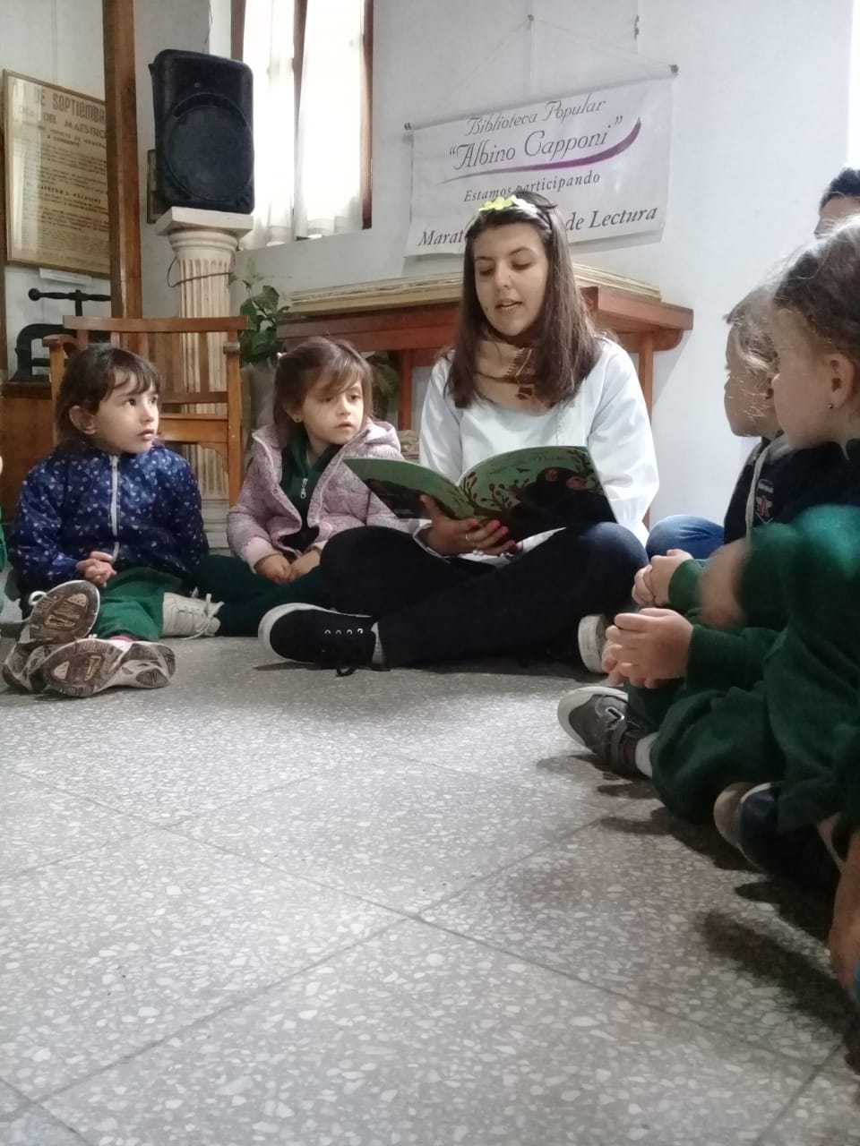 Los niños del Jardín, sala de 5 y sala multiedad A, fueron de visita a la Biblioteca Popular Albino Capponi. Esta última realizó dicha salida en la semana de maratón de lectura. Debido a razones climáticas la sala de 5 no pudo concurrir a la maratón realizada en el Nivel Primario