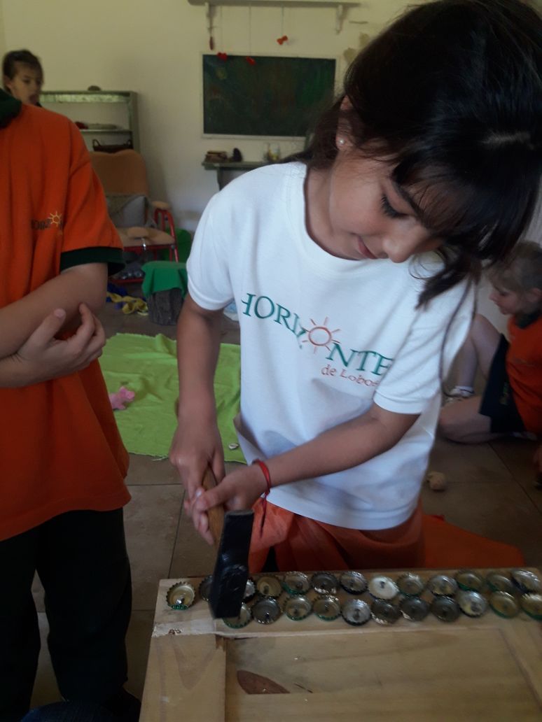 Los niños de sala de 5 hicieron una alfombra con tapitas para cuando entran con barro.