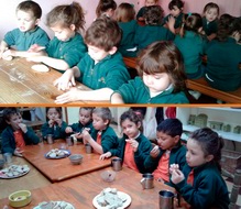 A modo de paneo de algunas de las muchas actividades del jardín van a encontrar a los chicos de sala de 2 desayunan el pan que amasaron ellos mismos.