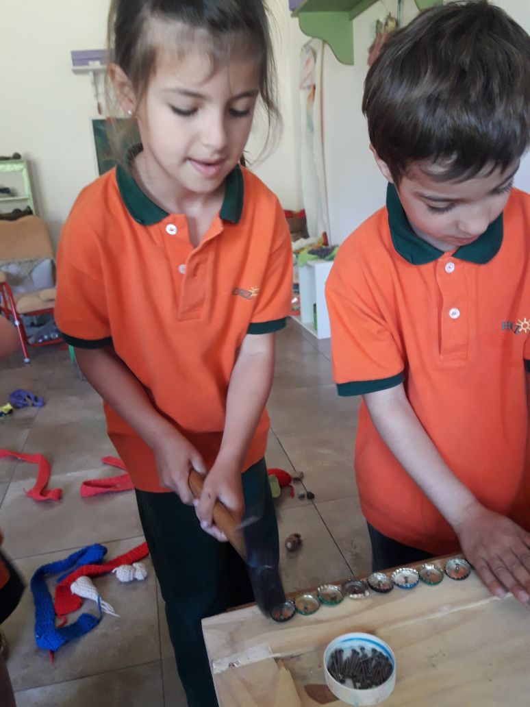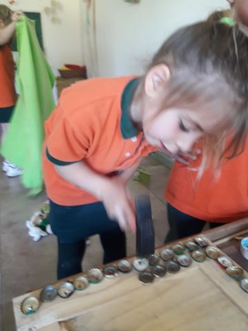 Los niños de sala de 5 hicieron una alfombra con tapitas para cuando entran con barro.